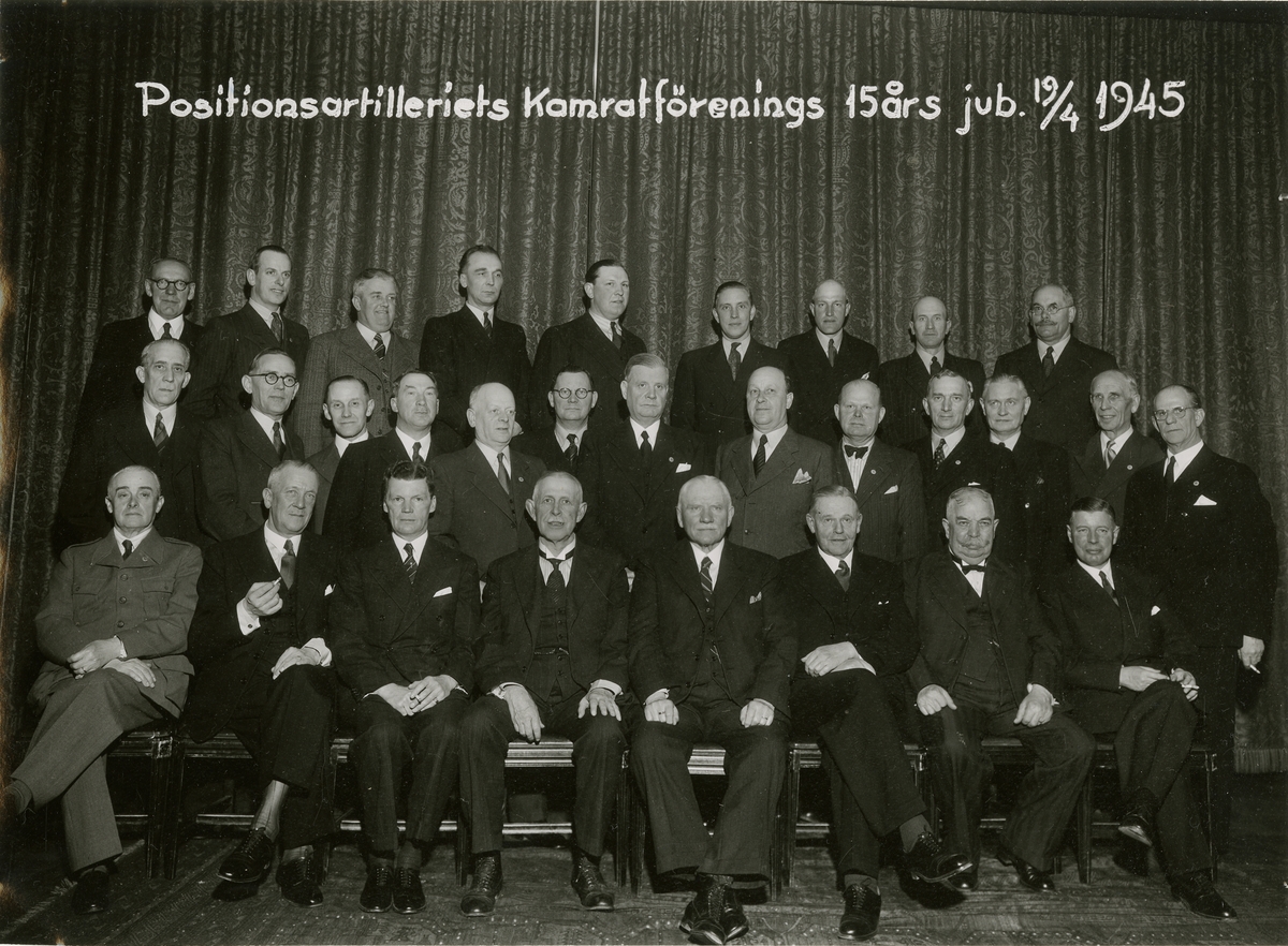 Grupporträtt av Positionsartilleriets kamratförenings 15-årsminne 1945.