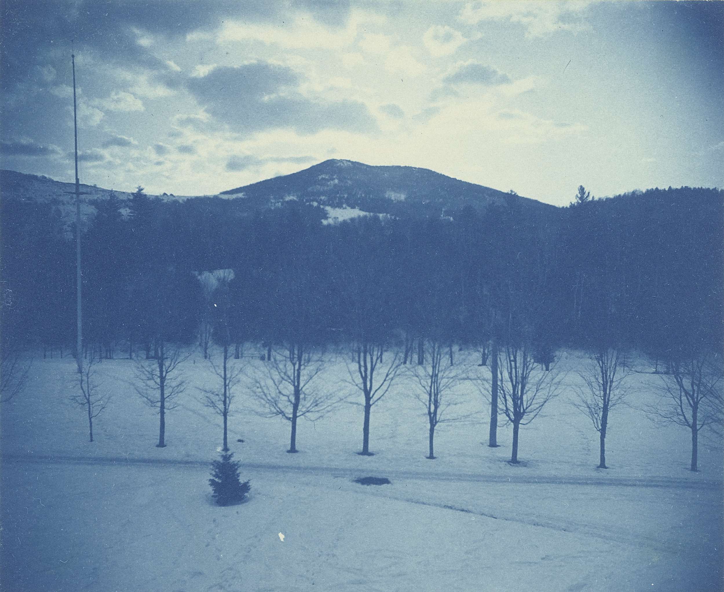 Landschap in de sneeuw: zonsopgang bij Thorn Mountain, gezien vanaf Iron Mountain House, Jackson, NH, Verenigde Staten