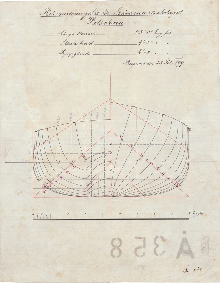 16ft Coppering Punt (circa 1875). Scale: 1:12. A plan showing the body plan, sheer lines, and longitudinal half-breadth for a proposed sixteen foot coppering punt. The plan also includes scantling and dimensions.