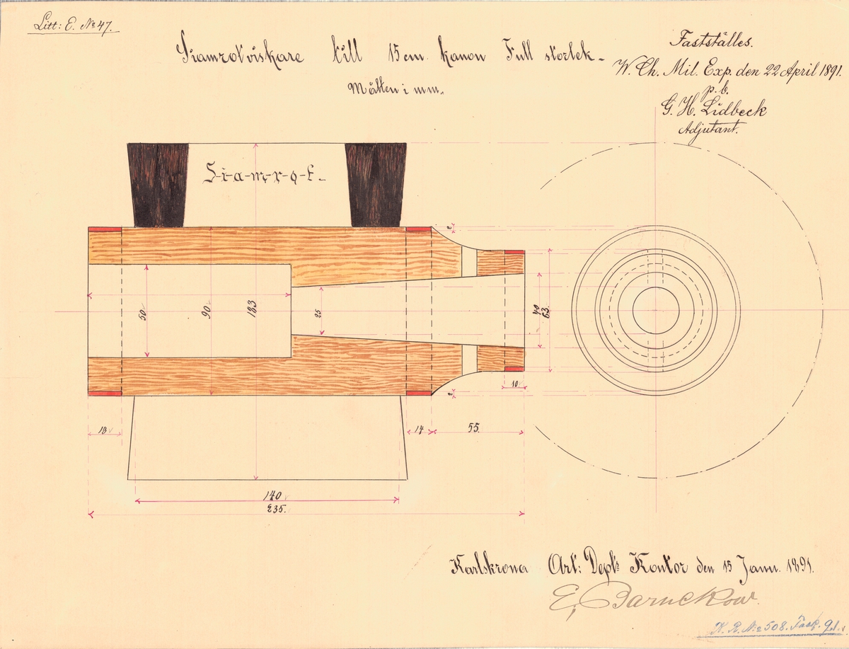 Griffon (1832). Scale: 1:12. Plan showing the section and plan of the sliding carriage, and the elevation of the carriage with the gun mounted illustrating how the cannon (side gun) was fitted amidships on Griffon (1832), a 10-gun Brigantine.