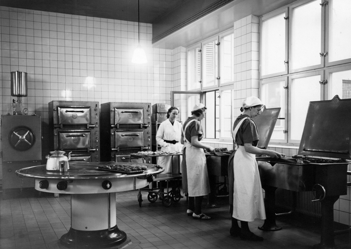 Matlagning i kök på F 2 Roslagens flygflottilj, 1939. Personal vid stekbord.