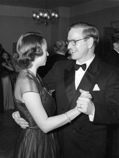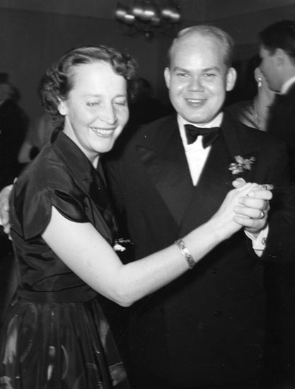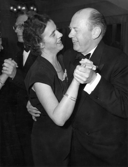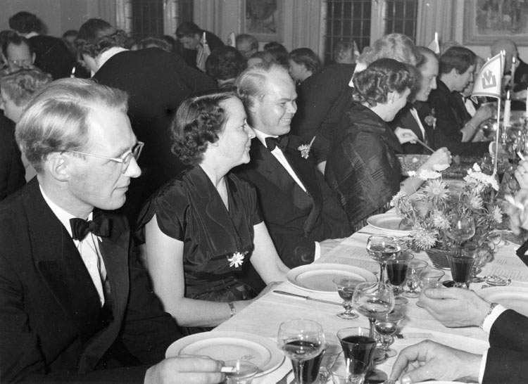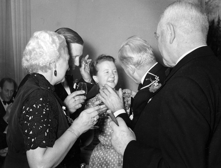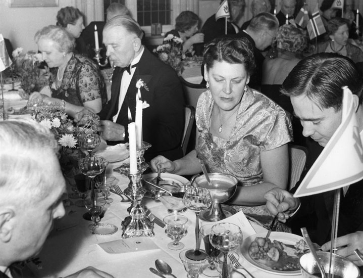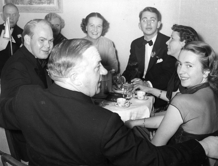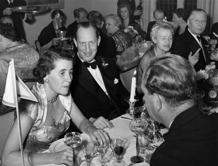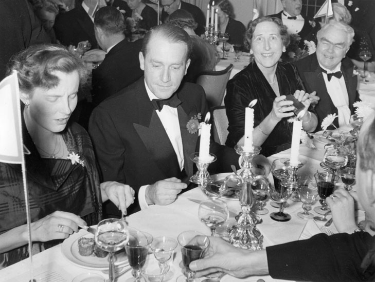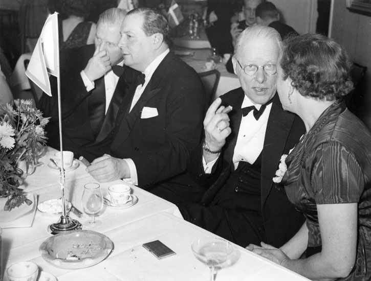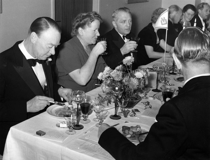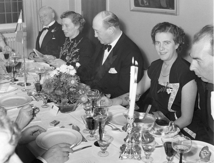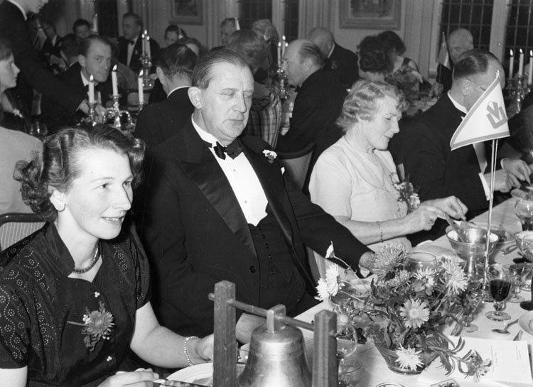 Sjösättningsmiddag för fartyg 126 M/T Aslaug Torm. Fartygets gudmor fru C. Mazanti Andersen till vänster i bild och bakom henne Helge Hagelin.