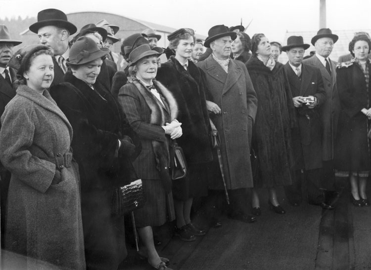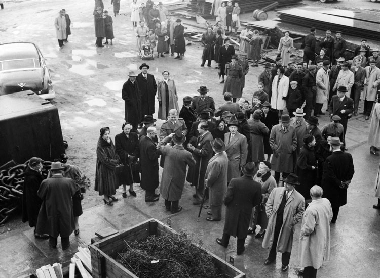Från dop och sjösättning av fartyg 126 M/T Aslaug Torm. Kvinnan med blombuketten är fartygets gudmor Fru C. Mazanti Andersen.