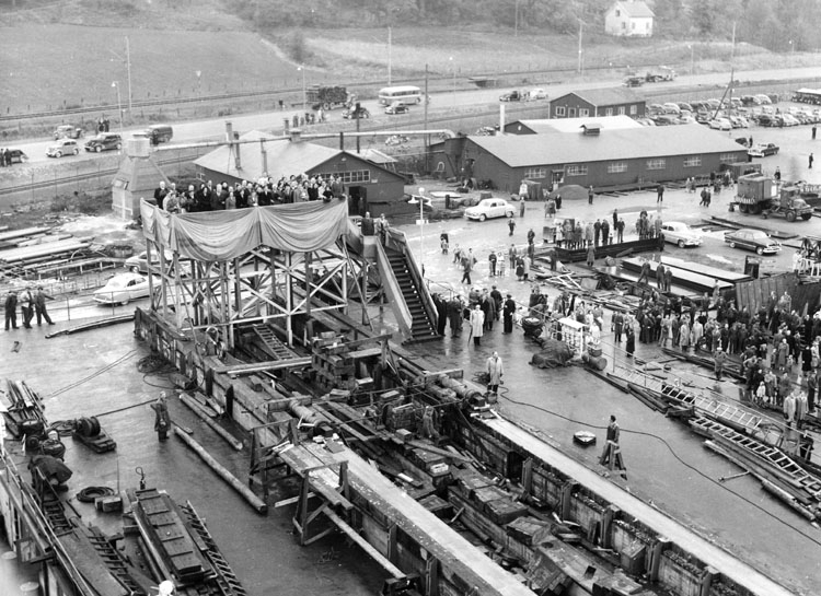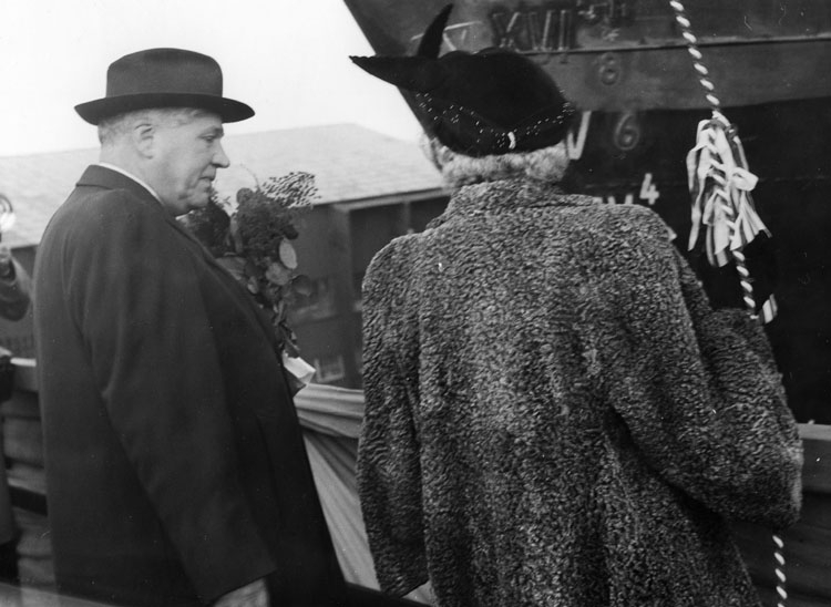Från dop och sjösättning av fartyg 126 M/T Aslaug Torm. Uddevallavarvets dåvarande VD Olof Sahlin tillsammans med fartygets gudmor Fru C. Mazanti Andersen.