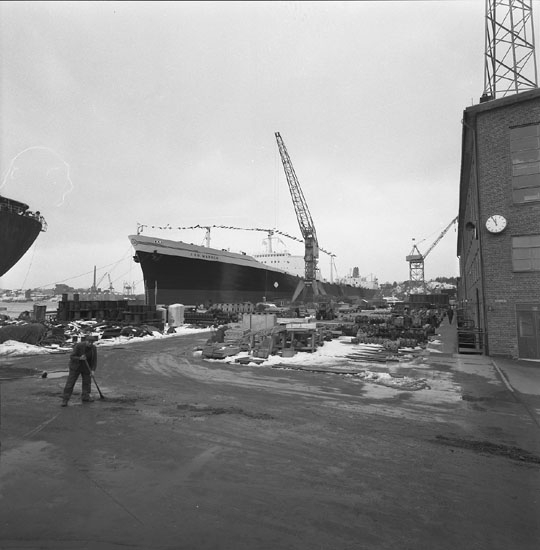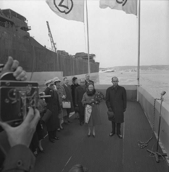 Dop av fartyg 205 T/T J. Ed. Warren. Fotografering av varvets dåvarande VD Tore Segerdahl och fartygets gudmor.