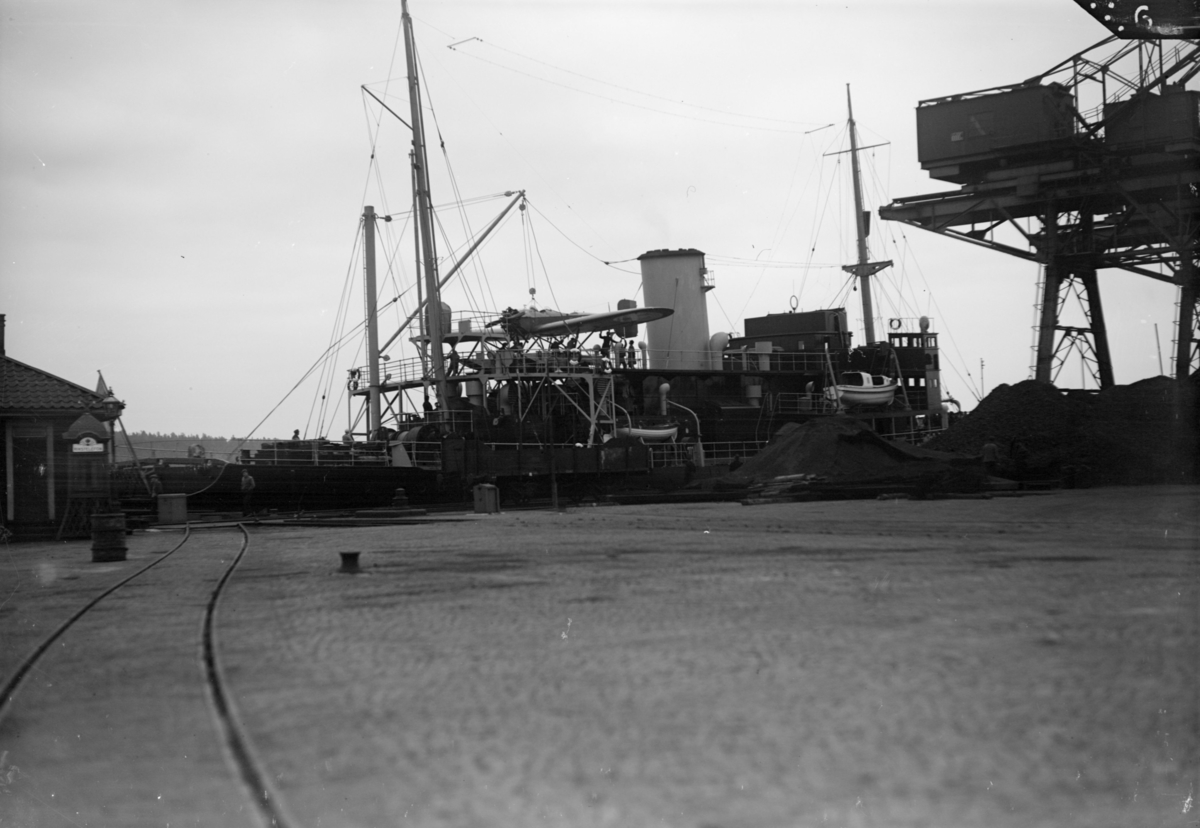 Flygplan S 5 lyfts med kran till ett fartygsdäck. Flygplanet hänger i lyftkranen.