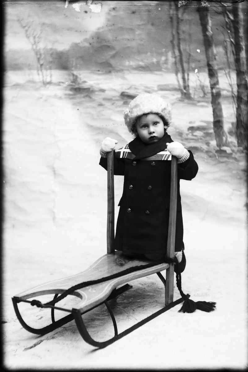Barn med spark i vinterlandskap. Fotot taget i ateljé.