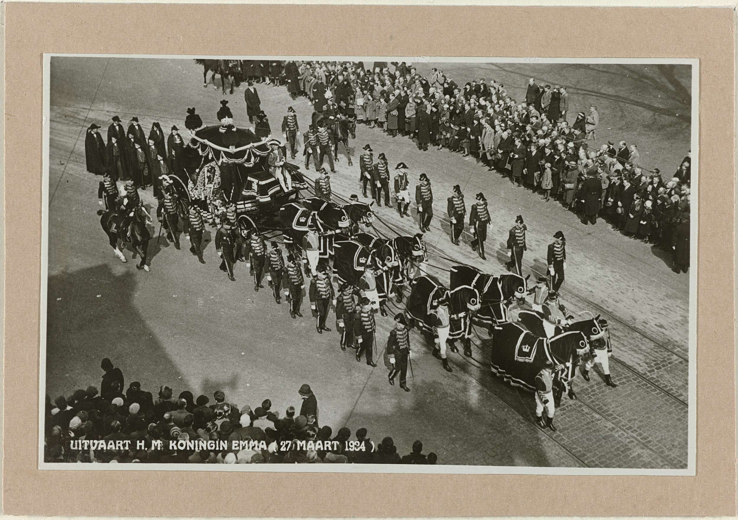 De aankomst voor de Nieuwe Kerk van de begrafenisstoet van Emma, koningin-regentes der Nederlanden, te Delft op 27 maart 1934