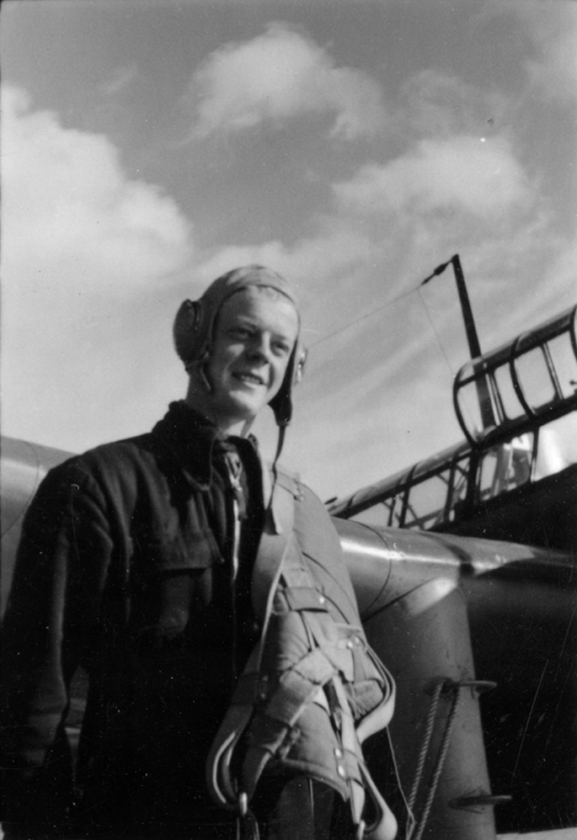 Flygaspirant Bertil Lidén, porträtt framför flygplan S 17 på F 2 Hägernäs, 1943.