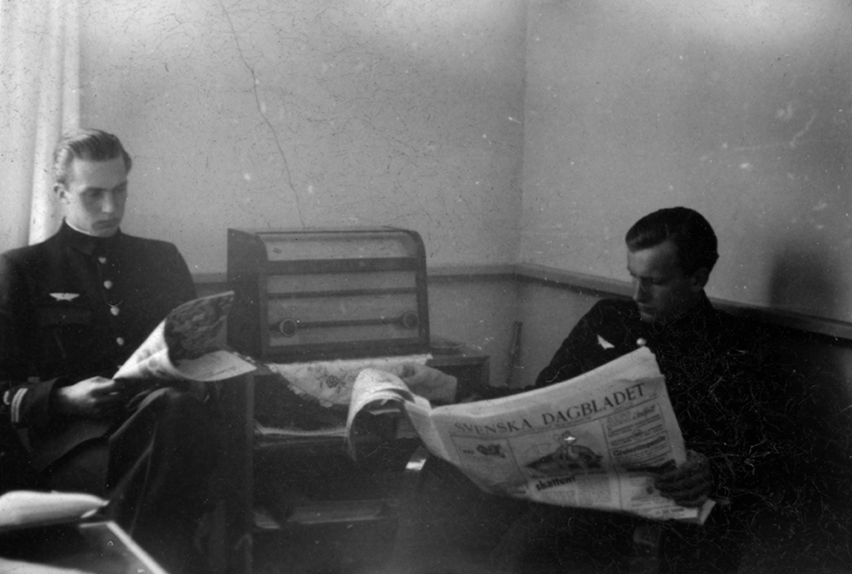 Interiör av kadett- och aspirantmässen på F 2 Roslagens flygflottilj, 1943. Flygaspiranter under rast. Tidningsläsning, fika och spel.