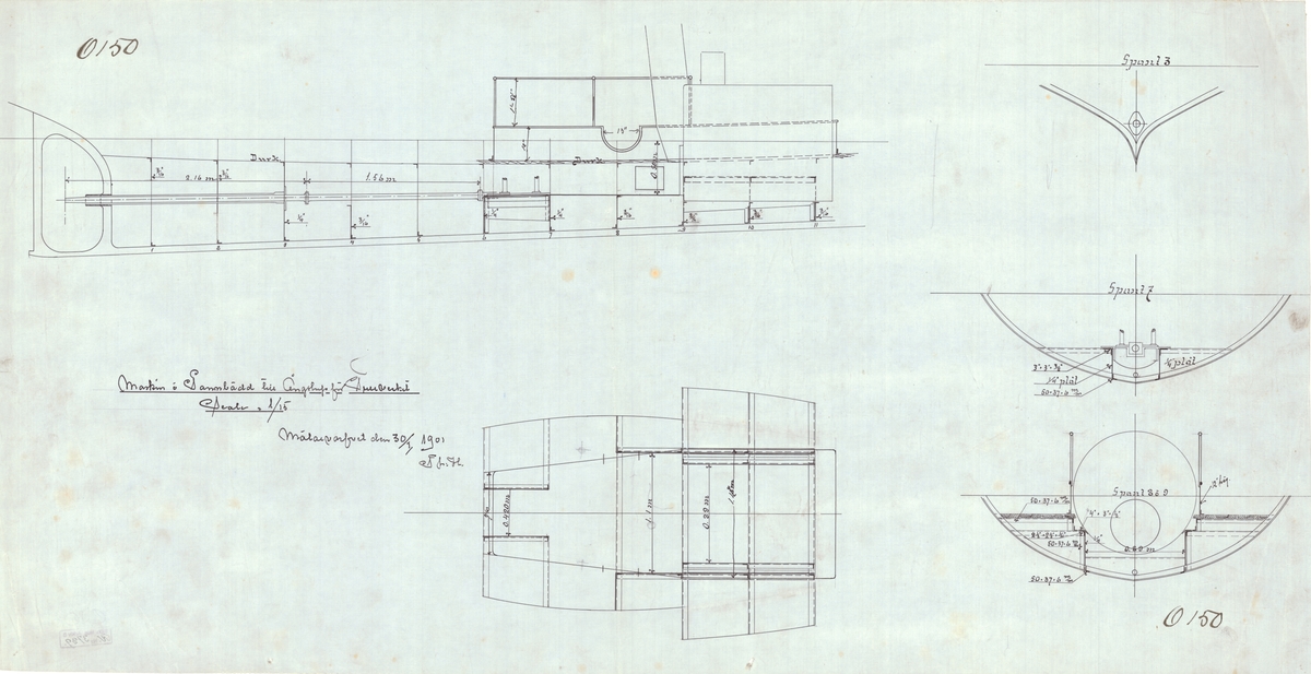 Devastation (1871). Scale 1:48 Plan showing sections for the turret battleship HMS Devastation (1871), as fitted following her rebuild between 1890-92. This included new guns (10 inch breech-loaders), boilers, engines, and steering gear. Sections at fra