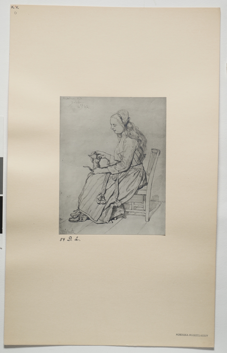 Teckning av flicka med katt. Magdalena N.D Hälsingland. Magdalena bär bindmössa, ett uppknäppt livstycke, överdel, kjol och förkläde med breda band. I famnen har hon en kattunge.
