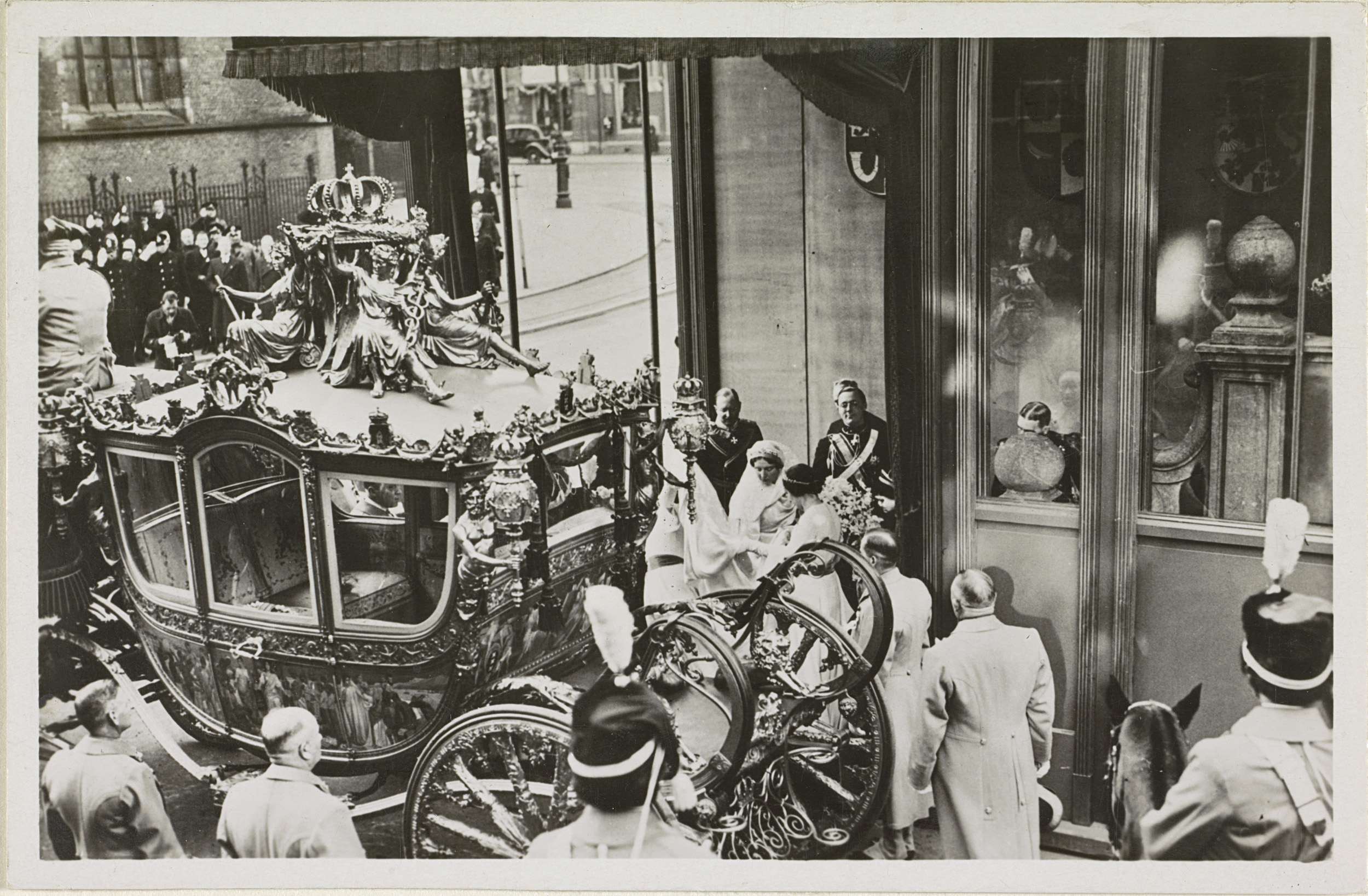 De gouden koets van de huwelijksstoet van Juliana, koningin der Nederlanden, en Bernhard van Lippe-Biesterfeld te Den Haag op 7 januari 1937