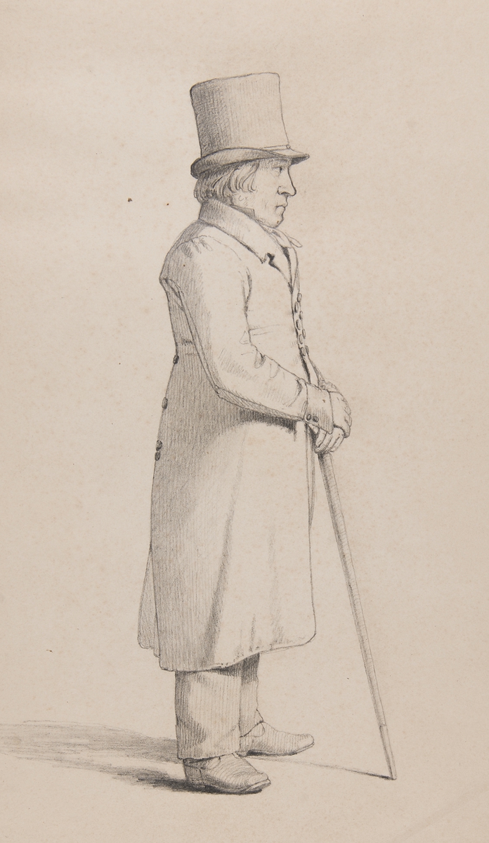 "Bonde från Karraby" Man i dräkt med hatt och käpp, stående i profil helfigur. Karaby. Blyertsteckning i storformat av Otto Wallgren.