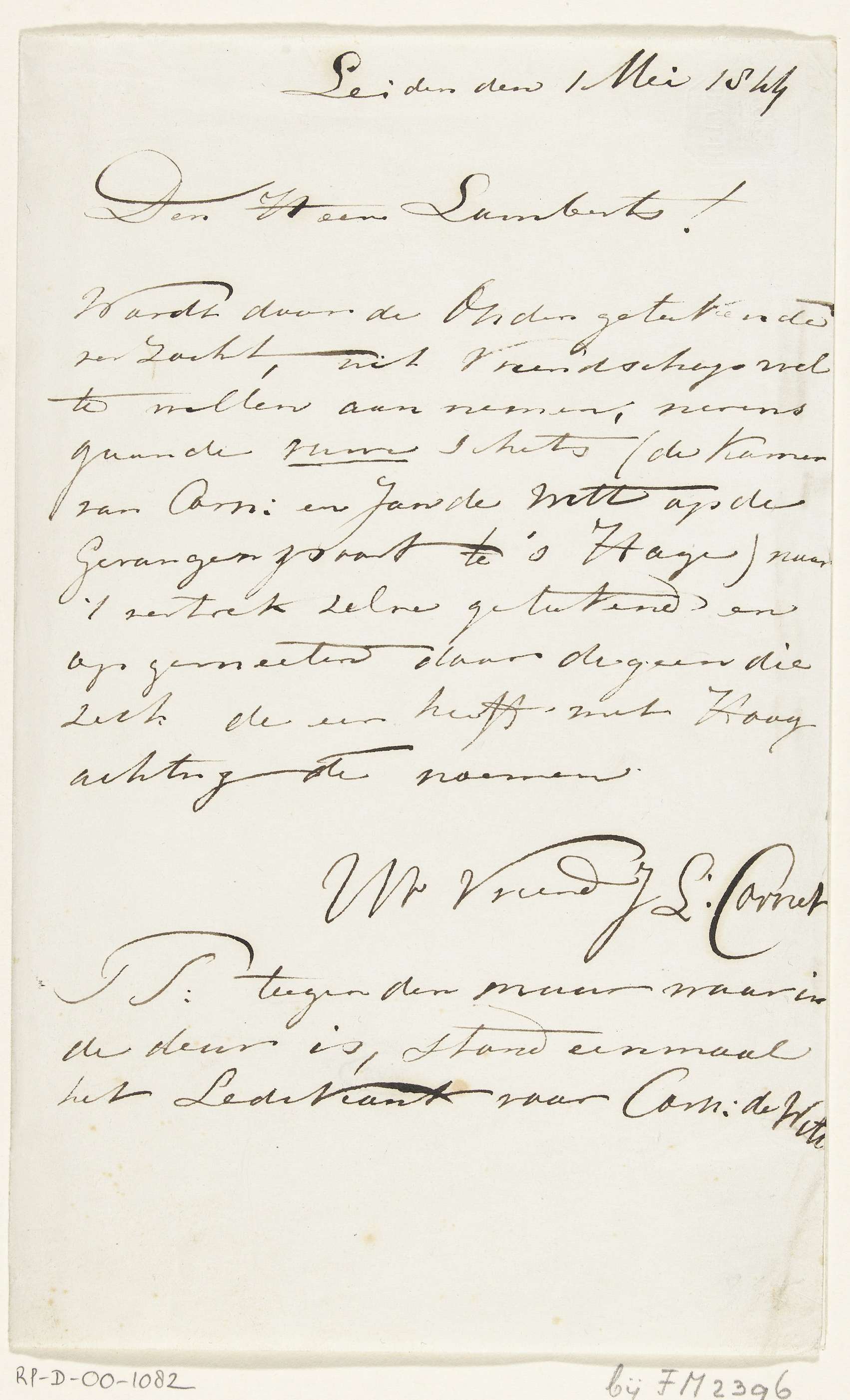 Brief van J.L. Cornet aan dhr. Lamberts over de tekening van de kamer van Cornelis de Witt in de Gevangenpoort, 1844