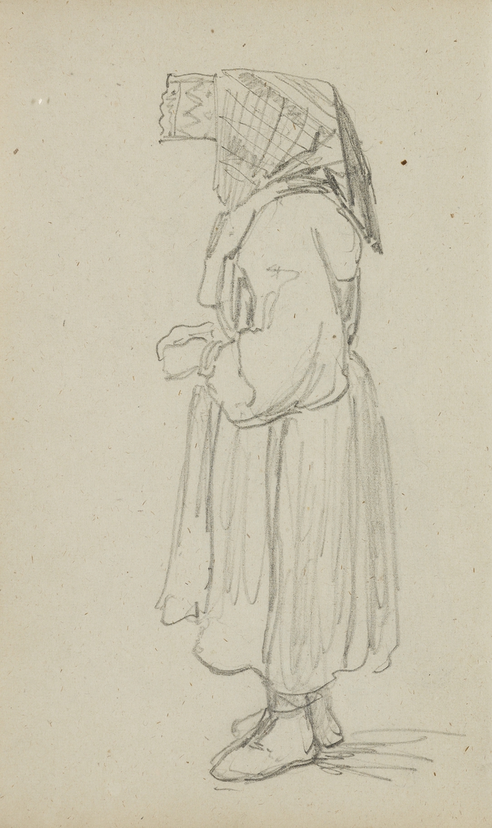 Blyertsskiss. Kvinna i helfigur i profil, Floda. Ur Skissbok av J.V. Wallander Nordiska museet föremål (arkivet) invnr. NM.0053744