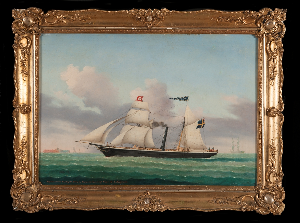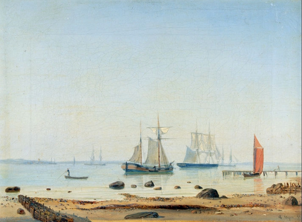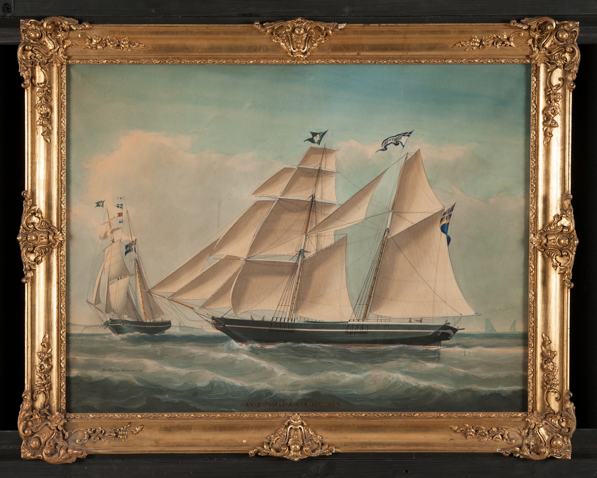 The barque ‘William Fisher’. A ship’s portrait of the ‘William Fisher’ shown in broadside view under sail. She was built in Liverpool in 1844 and is shown sailing off the coast. Several sailing ships can be seen at anchor on