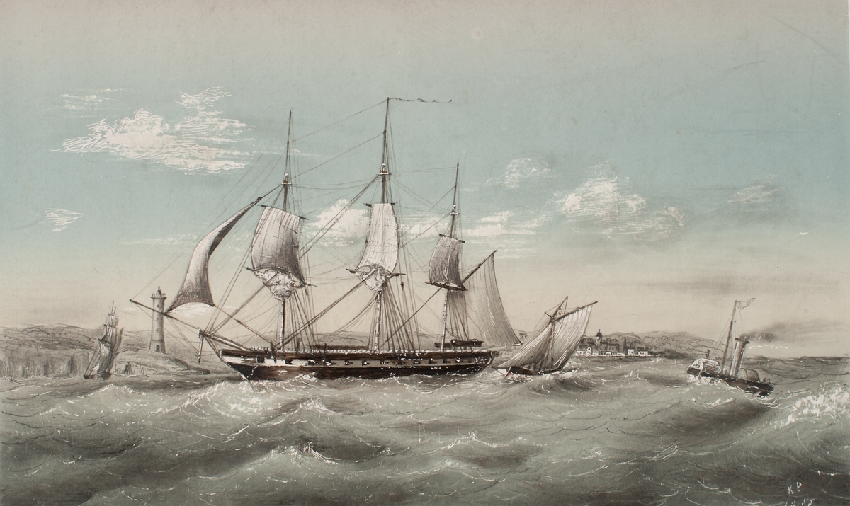 The barque 'Queen Bee'. A portrait of the barque ‘Queen Bee', shown broadside-on. The ship flies the flag with her name on the main mast. A lighthouse and coastal scene with houses can be seen in the distance on the left. There is oth