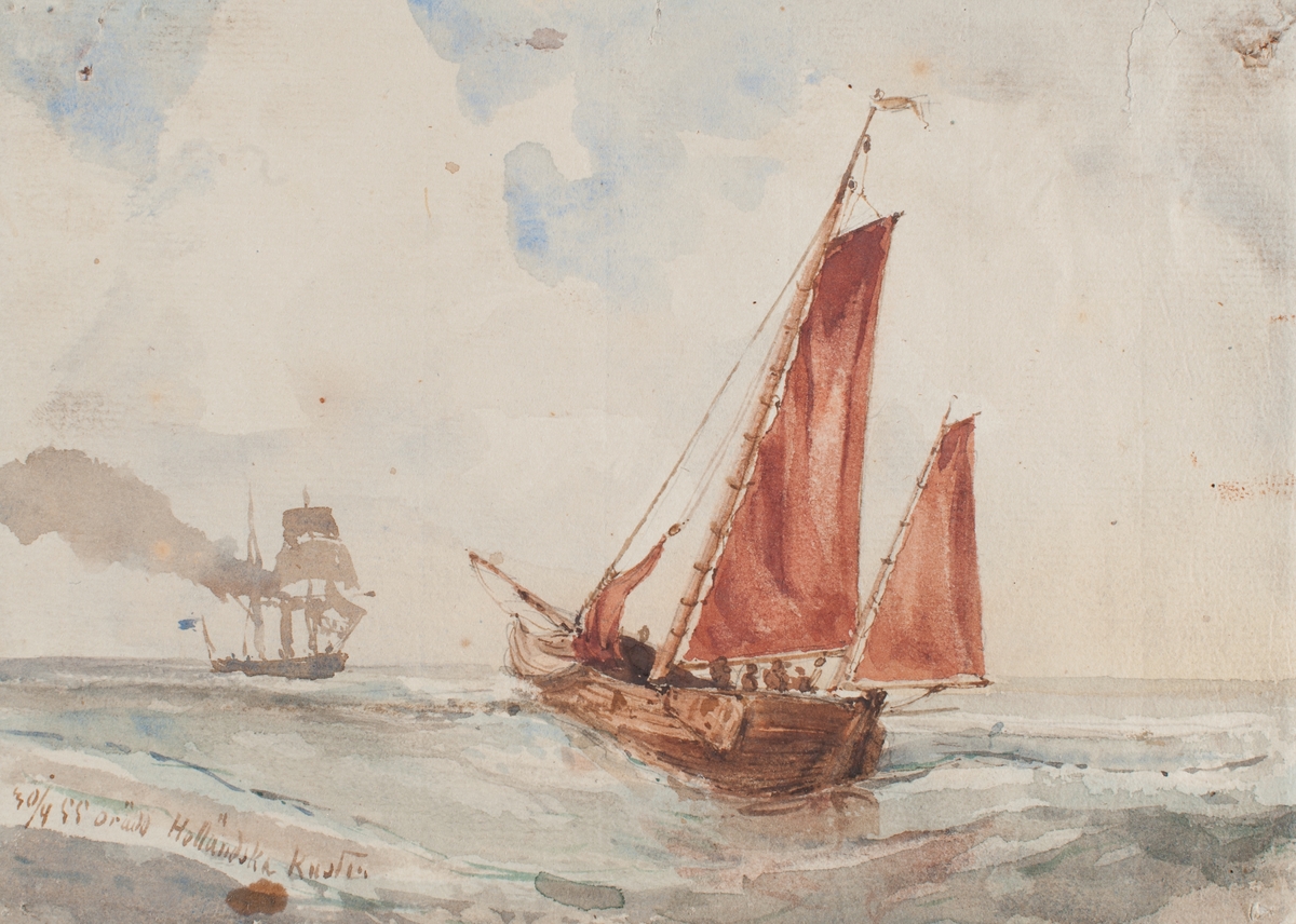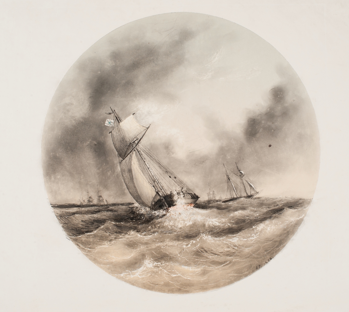 Row boats pulling towards the Baltic Fleet. Signed by artist and dated.; Heightened with white.; Medium includes graphite.