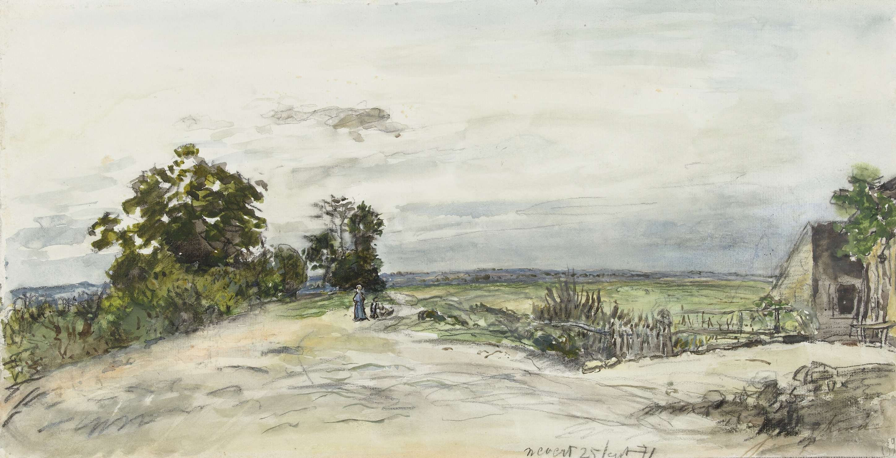 A countryside sketch of trees and fields; the elements in the foreground are more summarily sketches, with thick outlines, while the background has trees with very