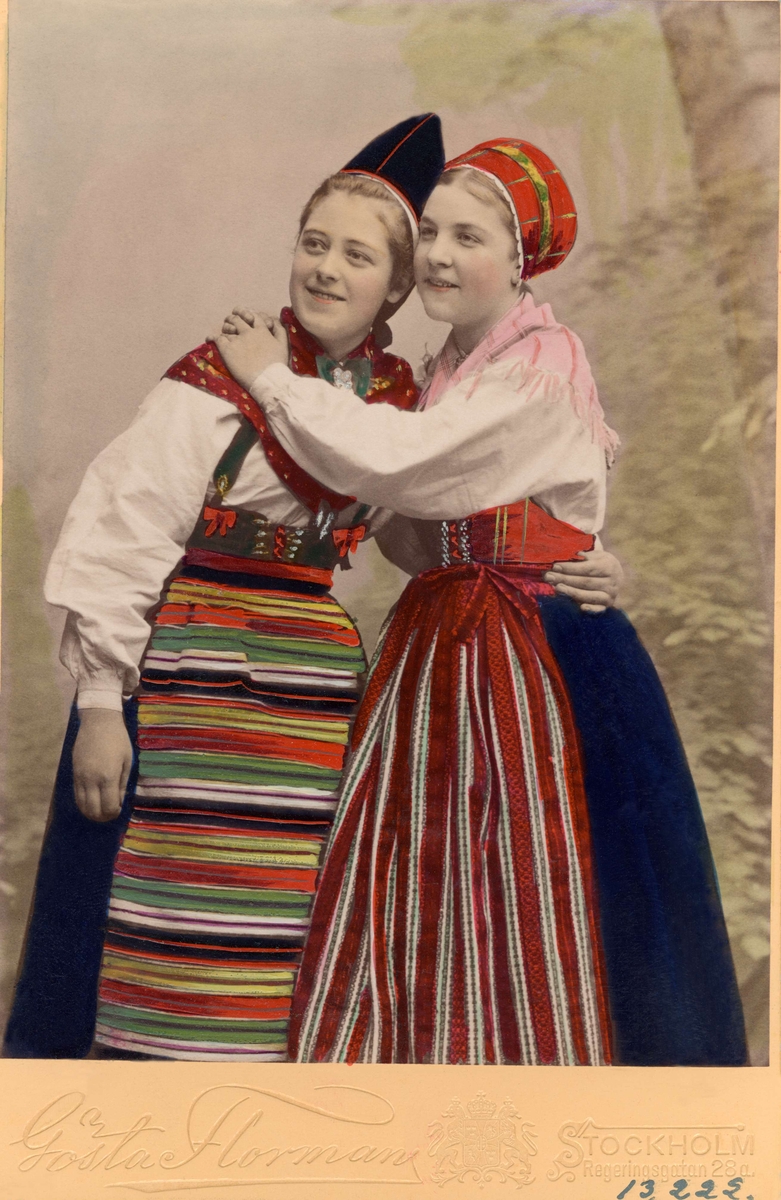 Två unga flickor håller om varandra, poserar i olika folkdräkter