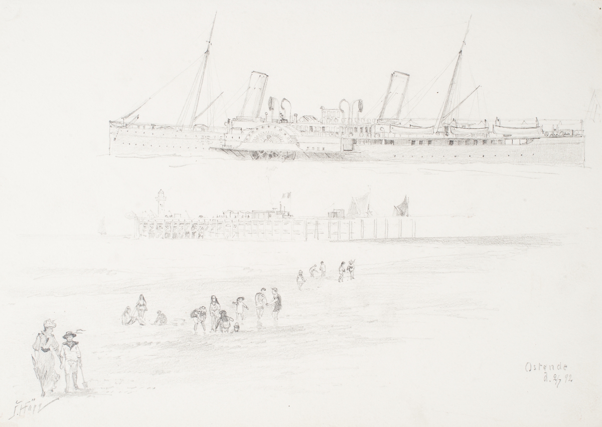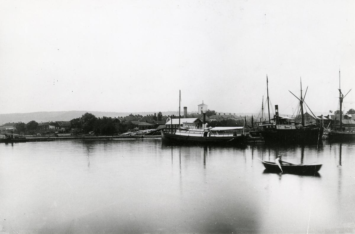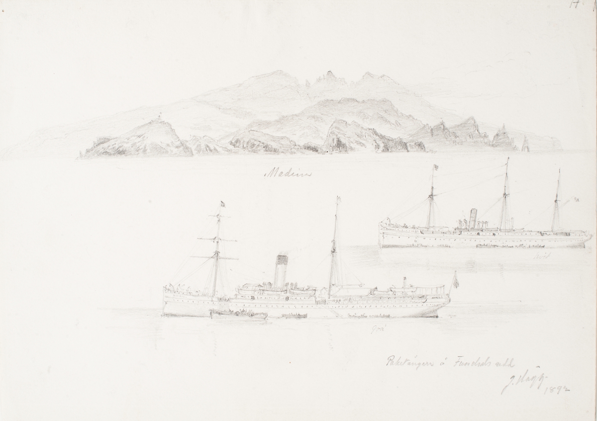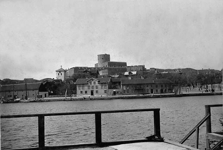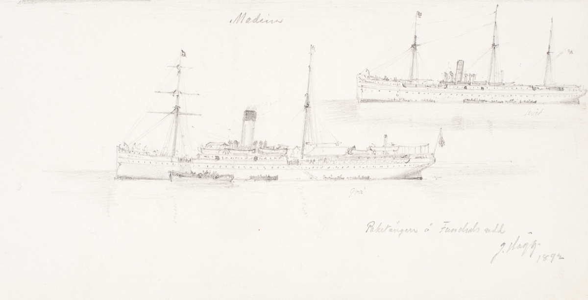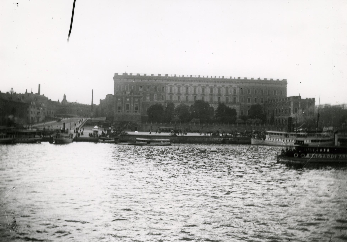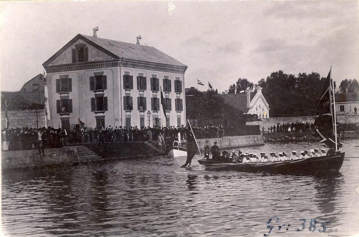 Kejsar Wilhelm II av Tyskland embarkerar sommaren 1892 Hohenzollern från Kungsbron, Karlskrona. Vid kejsarflaggan: Löjtnant Allan Meister.