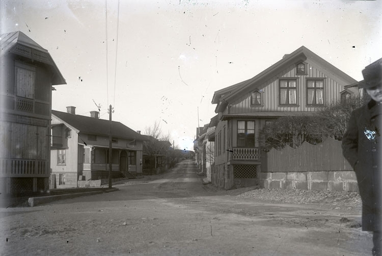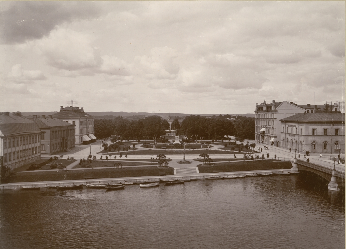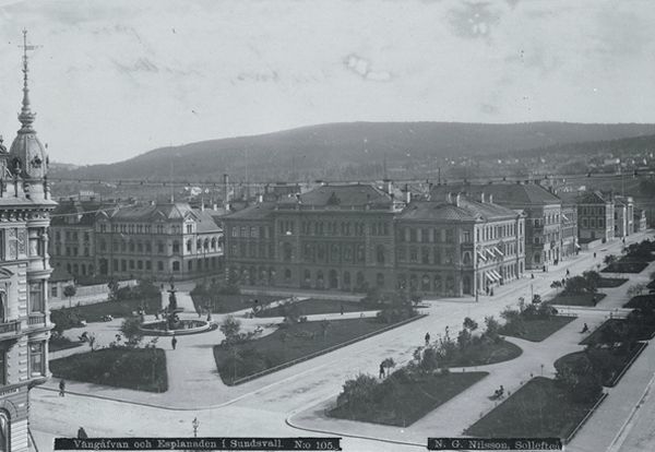 Vy över Vängåvan, Esplanaden och Kyrkogatan. Kvarter från vänster: Olympen, Saturnus (Gamla Posten), (Sundsvalls Enskillda Bank), Vesta, Mars, Kassören (Teatern). Bildtext till vykort "Vängåfan och Esplanad