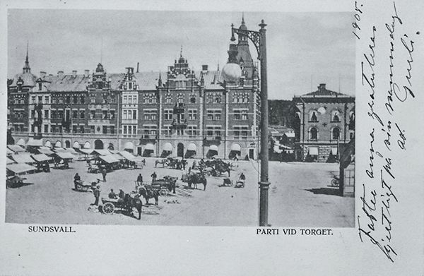 Stora torget med torghandel, hästar och vagnar. I bakgrunden ses bl a Granska huset. Vykortet har en personlig gratulationshälsning med årtalet 1905. Tryckt bildtext: "Sundsvall. Parti vid torget."