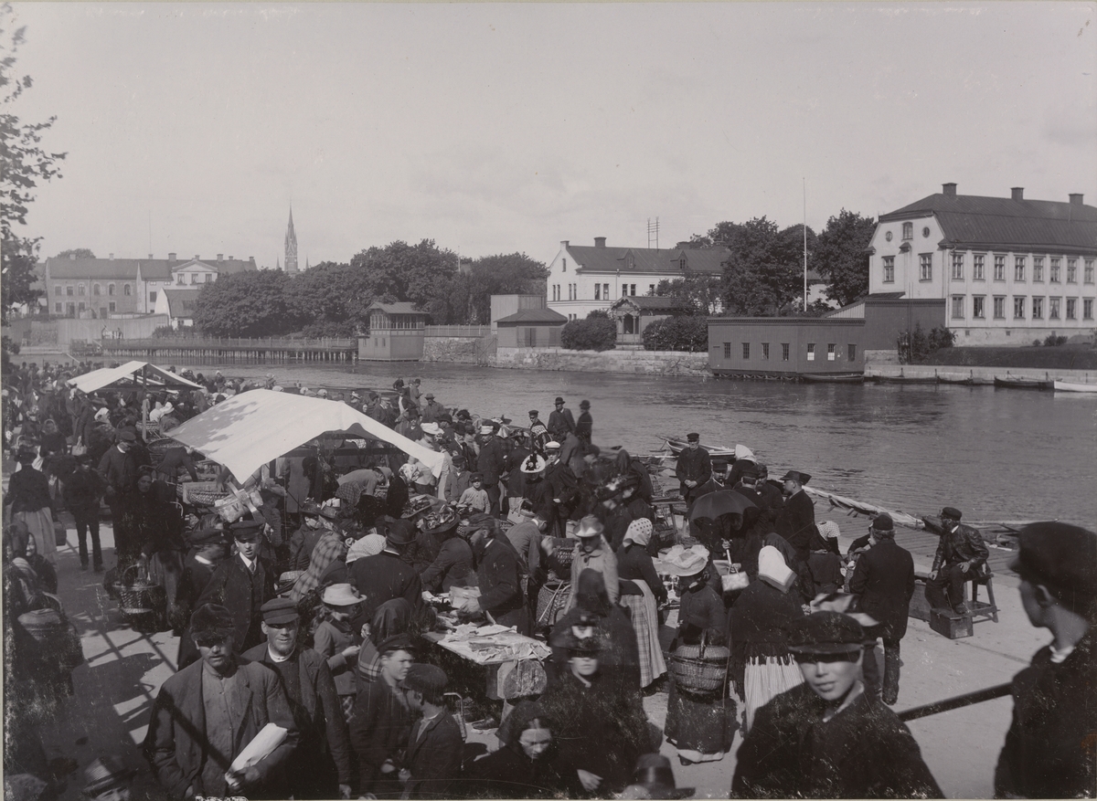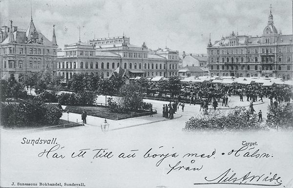 Marknadsbild från Stora torget. Med på bilden Esplanaden, Stadshuset och Hirschska huset. Tryckt text på vykortet "Sundsvall. Torget. J. Sunessons Bokhandel, Sundsvall."