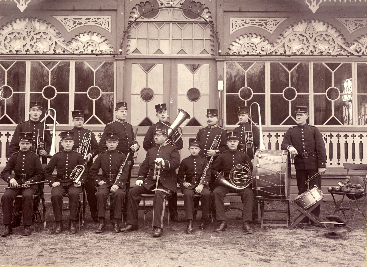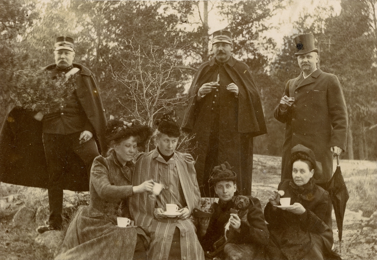 Officerare och kvinnor dricker kaffe, Oskar-Fredriksborg våren 1892.
