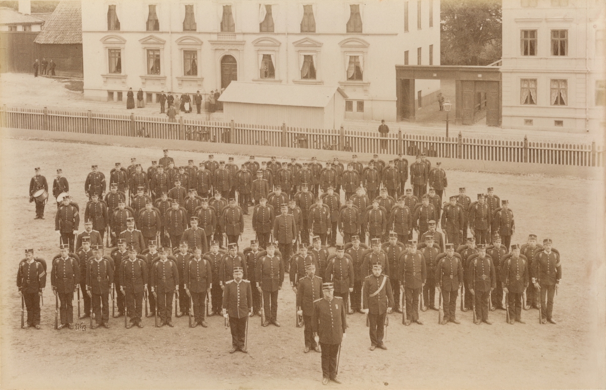 Soldater från Andra Livgrenadjärregementet I 5 står uppställda framför byggnad. I bakgrunden syns kvinnor, män och lekande barn.