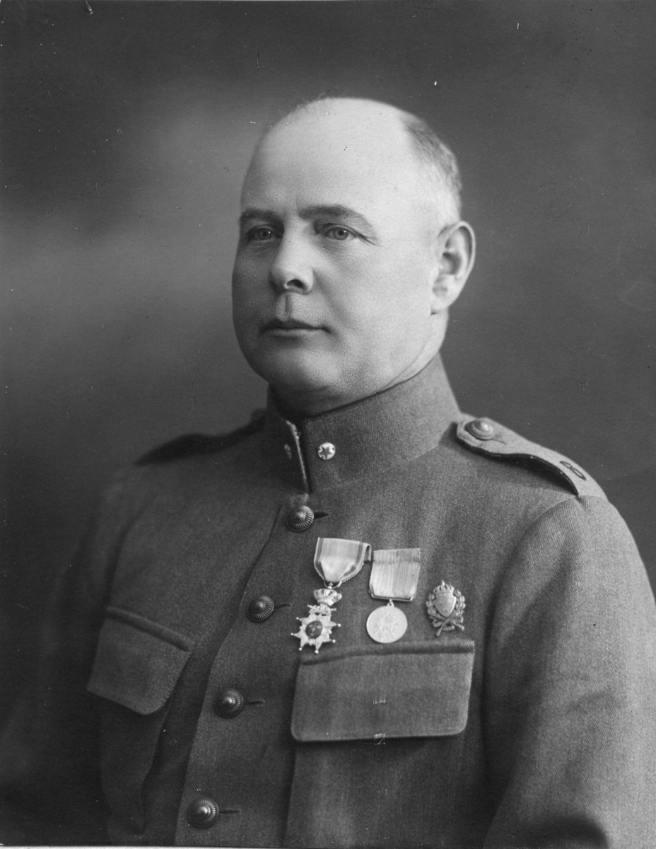 Besök på Malmen. En överste i profil i förgrunden. Kulspruta och träfftavla vid övningsskjutning i bakgrunden.