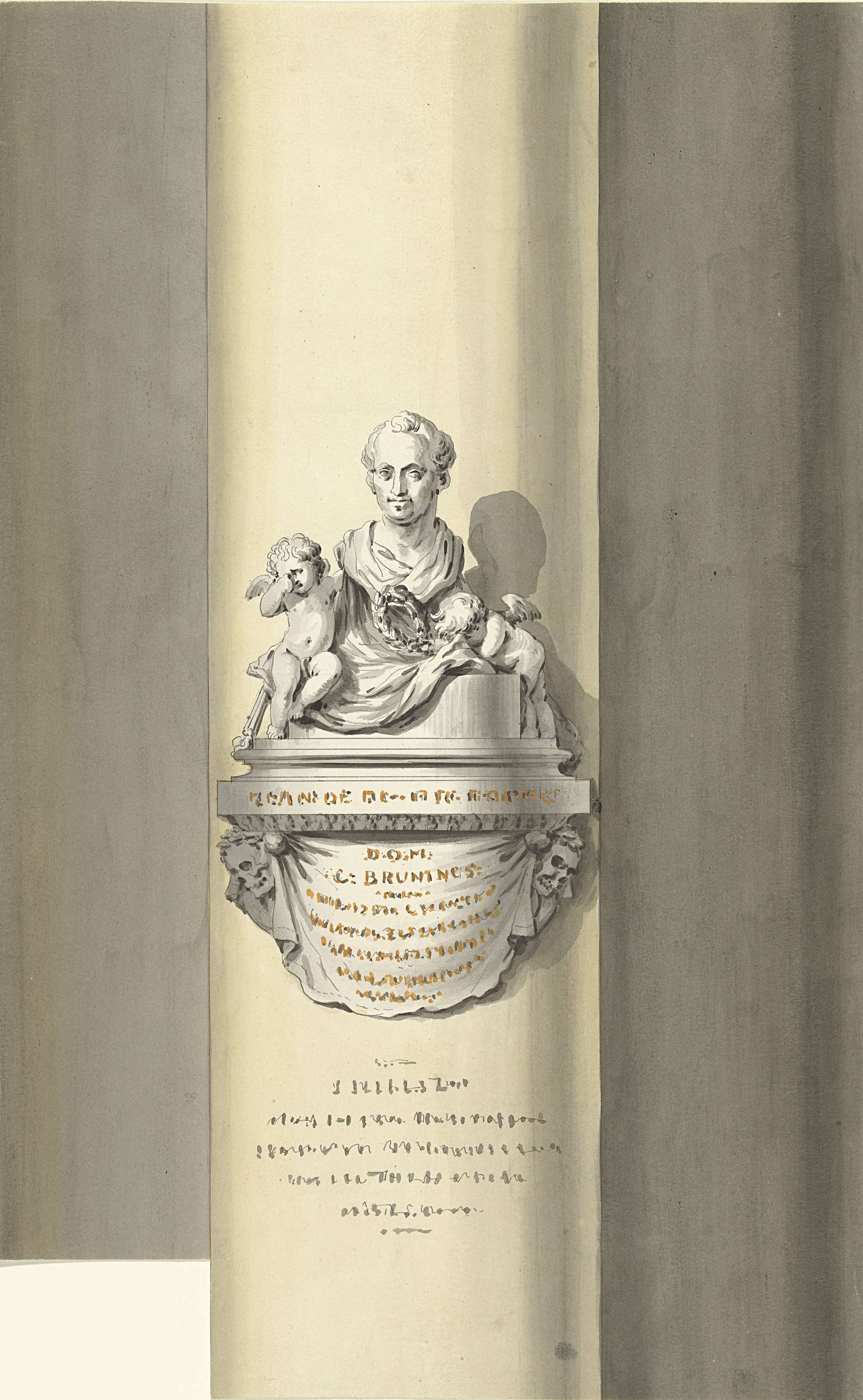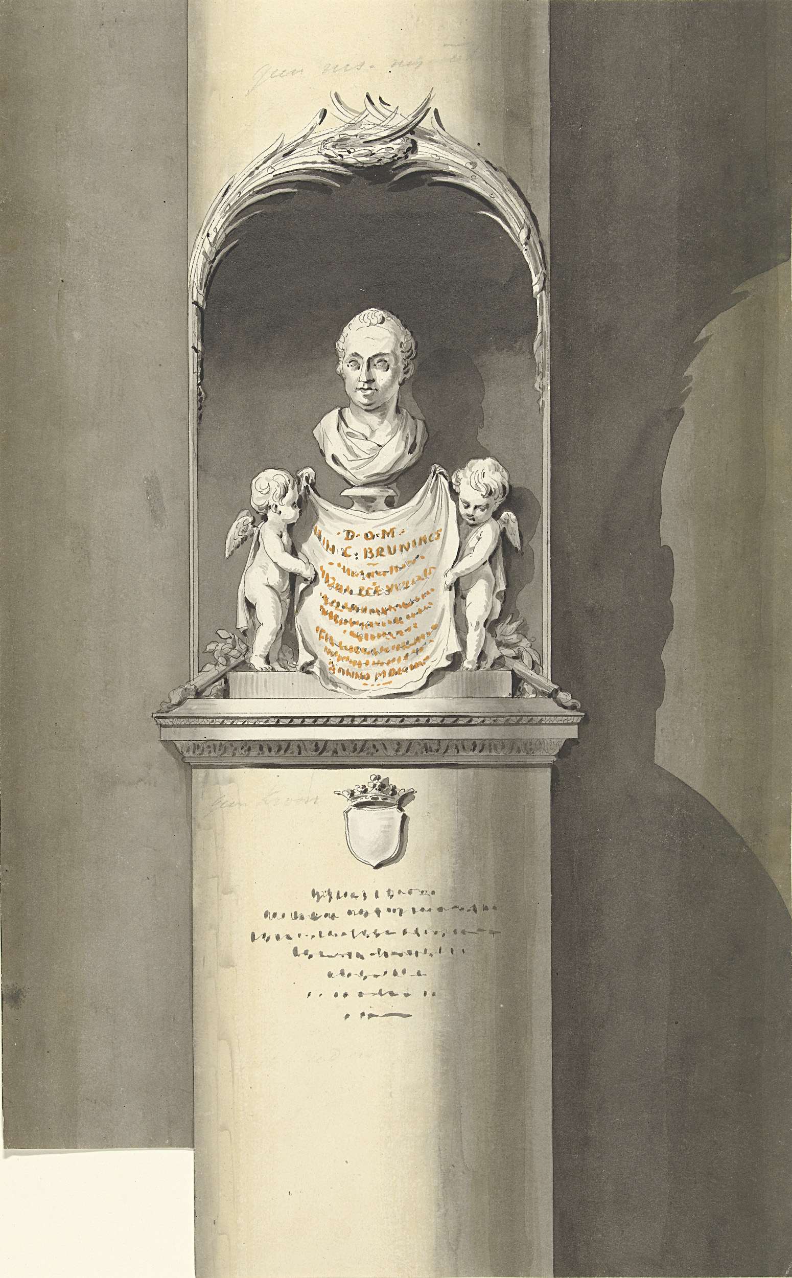 Emblematical Monument erected in the Guildhall of the City of Norwich for the preservation of the Sword presented by the late Lord Viscount Nelson. The Arms are the same which his Lordship bore when the Sword was presented. Technique includes aquatint.