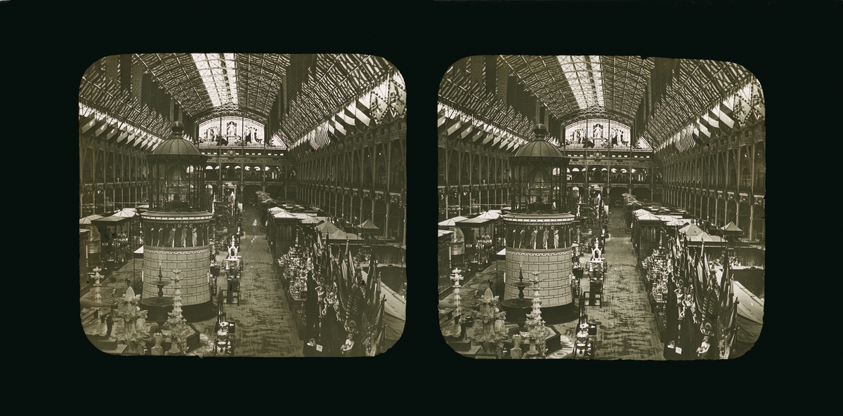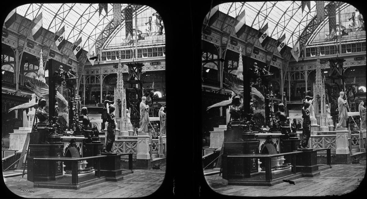 Stereoskopfotografi på glas, bild på olika skulpturer och statyer, troligen från världsutställningen i Paris 1855.