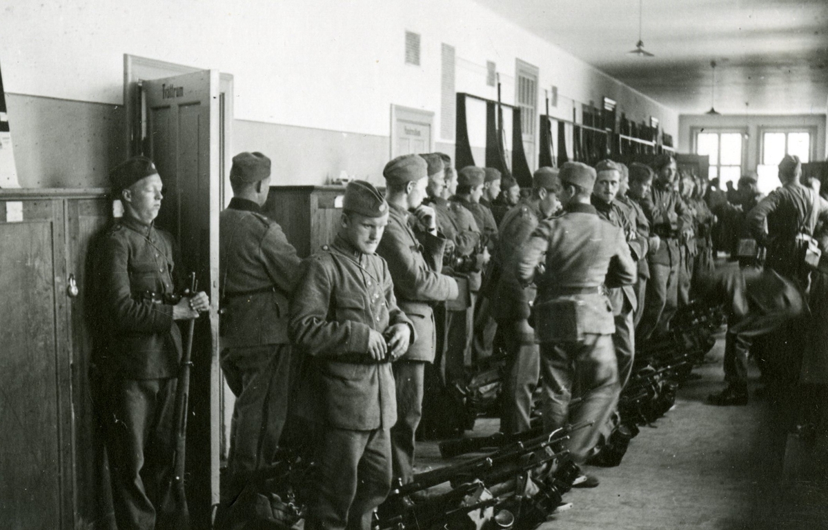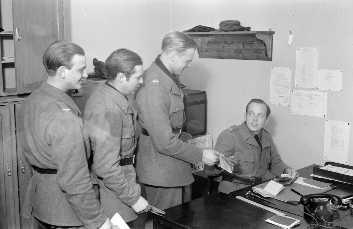Utbetalning av lön till militärer tillhörande F 19, Svenska frivilligkåren i Finland. Tre män i kö till löneutbetalare vid skrivbord.