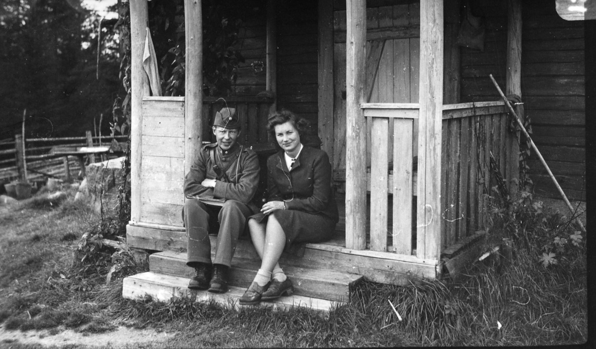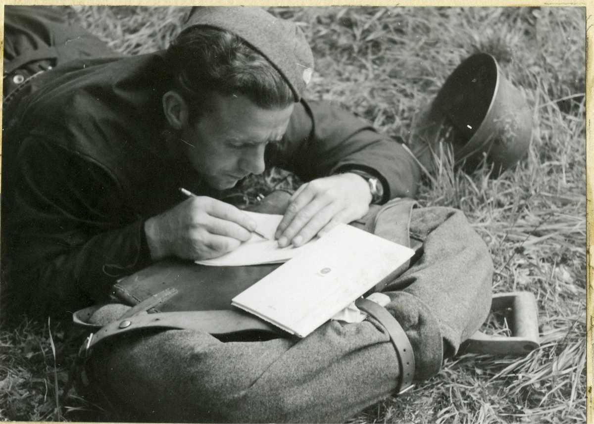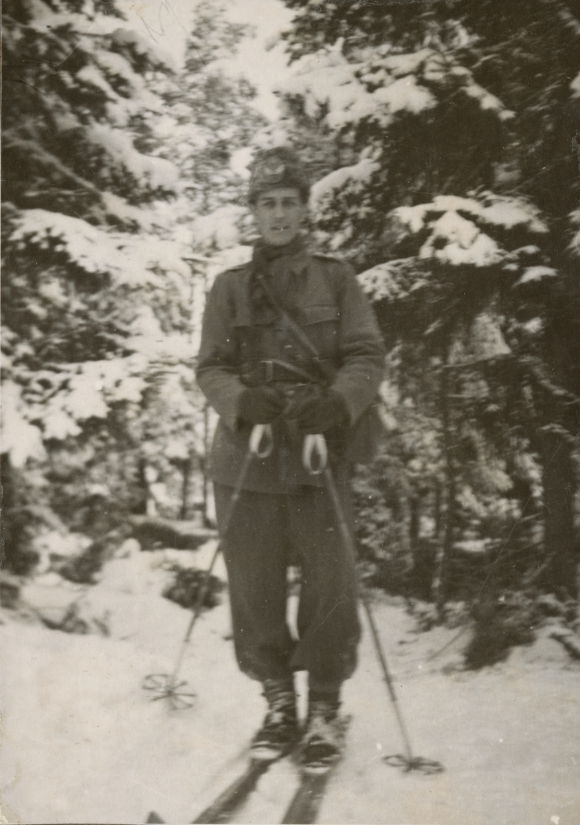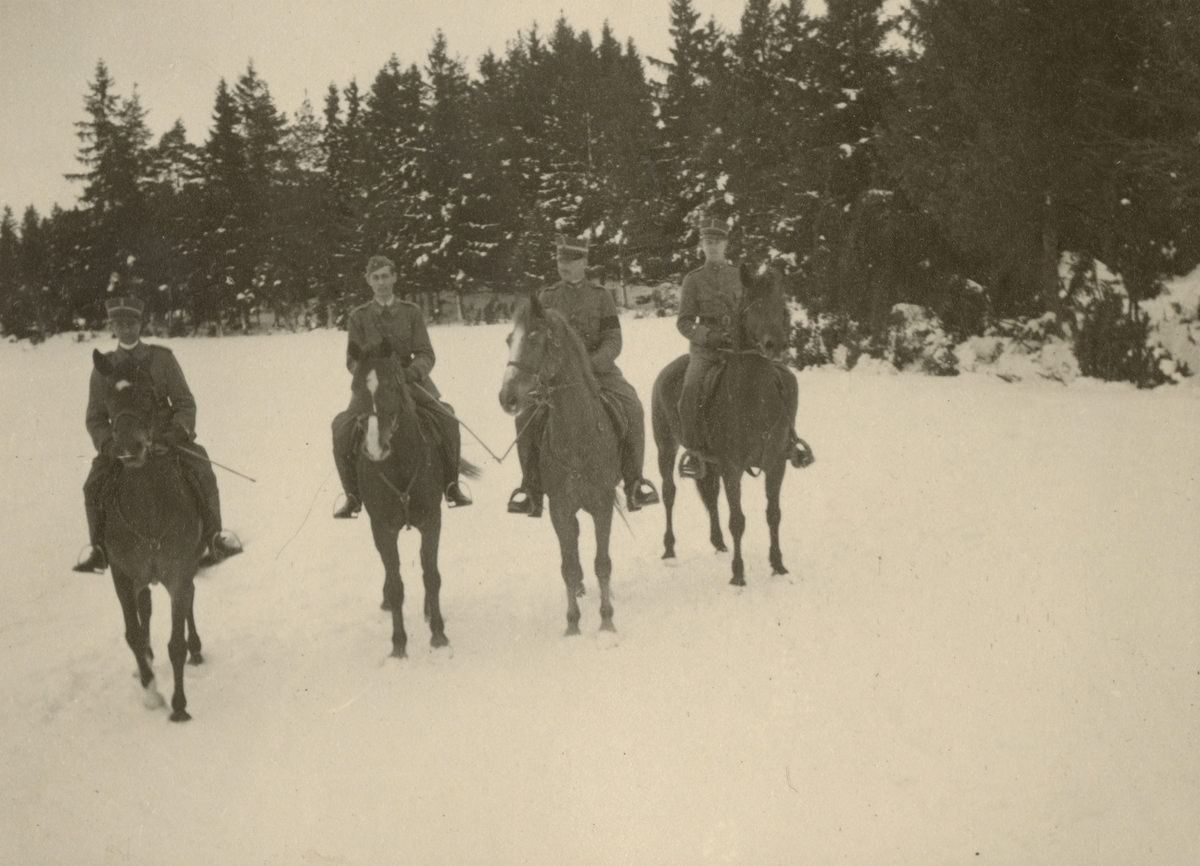 Vinterbild med fyra soldater från Södermanlands regemente I 10. Till vänster: löjtnant Gunnar Henricson och major Gustaf Frithz.