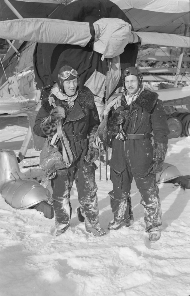 Två flygdräktsklädda flygskyttar tillhörande Svenska frivilligkåren i Finland, F 19, står framför flygplan Gloster Gladiator. Till vänster Thure Hansson, till höger Matti Sundsten.