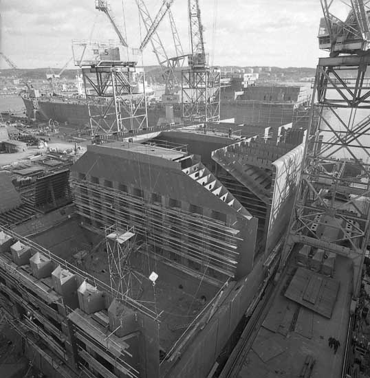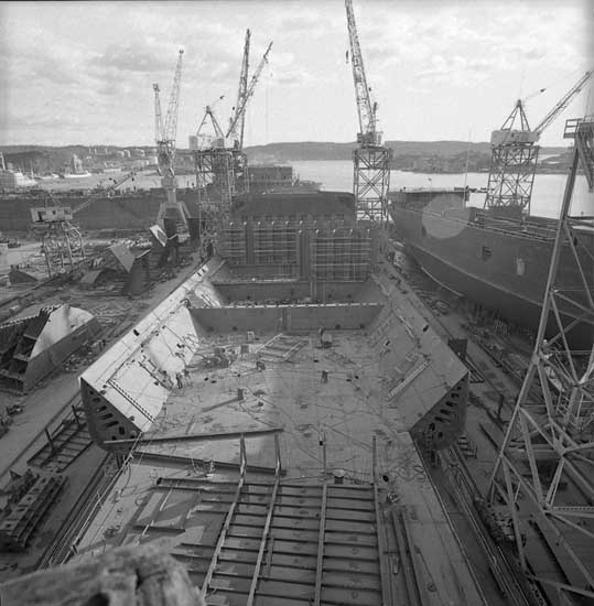 OBOfartyg 210 Havtor på stapelbädd III. I bakgrunden fartygsbygge på stapelbädd II.