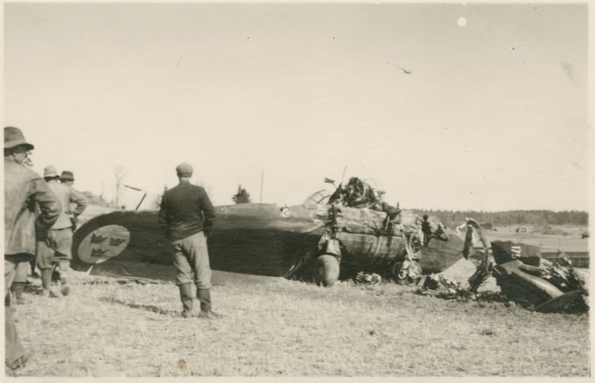 Havererat militärt skolflygplan SK 14 nummer 675, märkt F 5-175 på ett fält utanför Vittsäter, sydost om Nykil i Östergötland, den 30 april 1940. Män i närheten av flygplanet. Serie om 8 bilder.