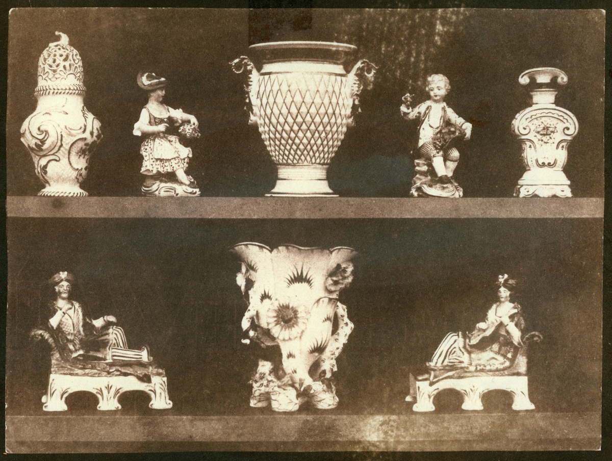 Originalkalotyp. "Porslin på två hyllor". Fotografiet är taget utomhus, på landet vid Lacock Abbey, troligen 1841/ 1842.