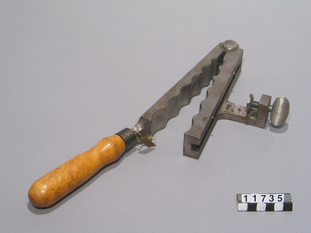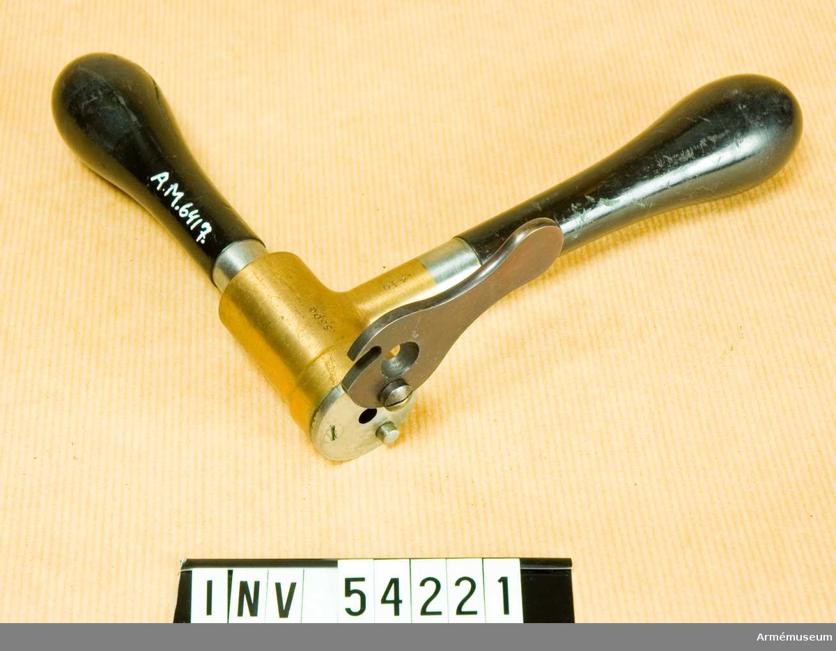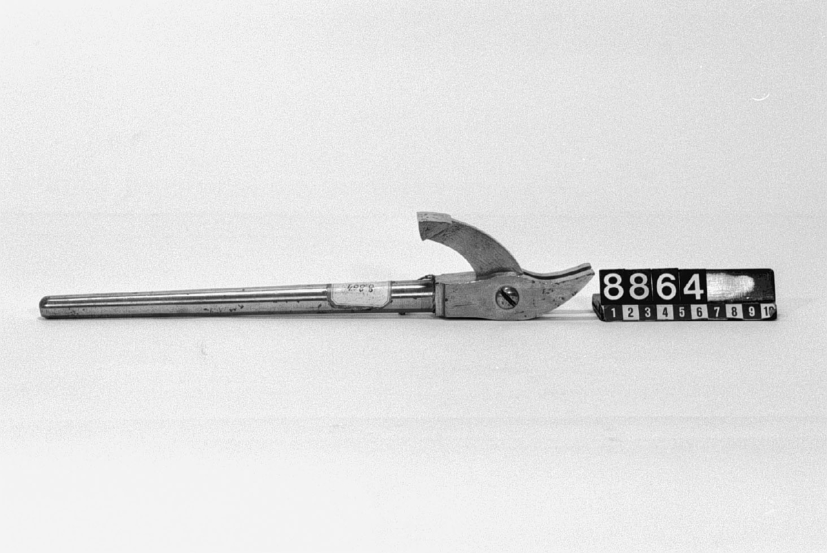 Beaumont-Adams. Revolver. The stock consists of a chequered walnut grip with steel butt plate, solid steel frame and steel trigger guard. A Kerr rammer is fitted to the left side of the front of the frame and barrel. A safety catch is fitted to the rear o