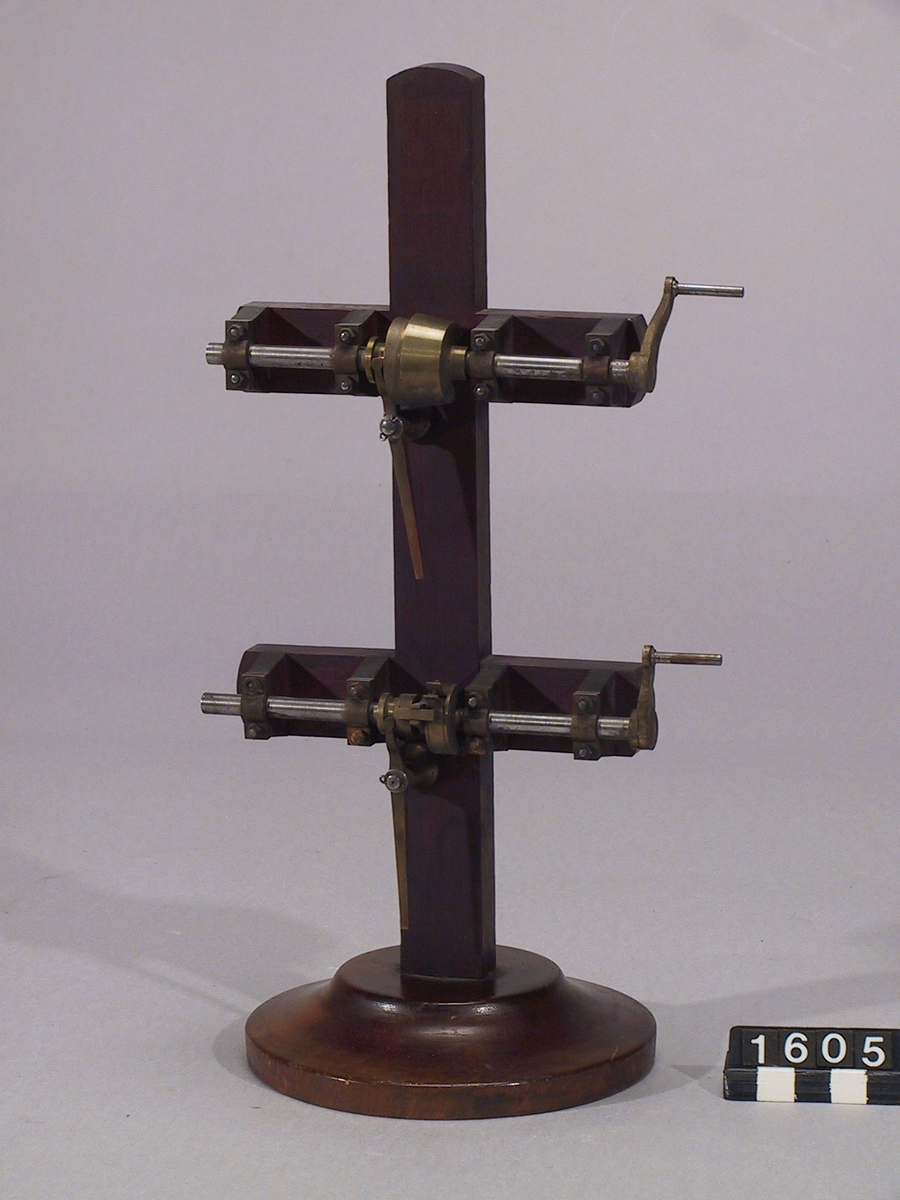 . Card- Mica with painted markings. Grey with black markings graduated to 1/4 points. Has decorated East point. Brass crossbar beneath card carries two moveable weights.