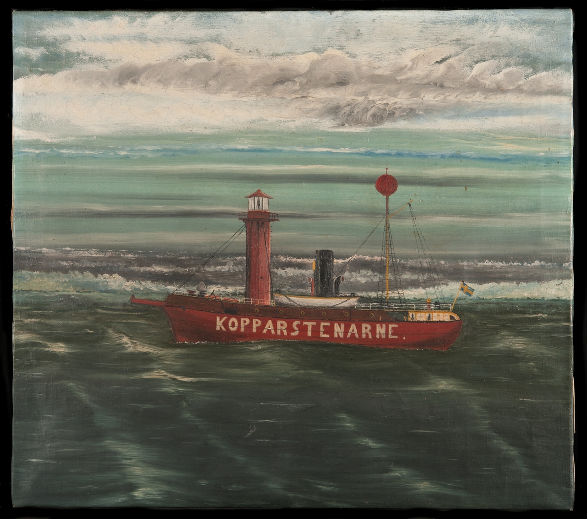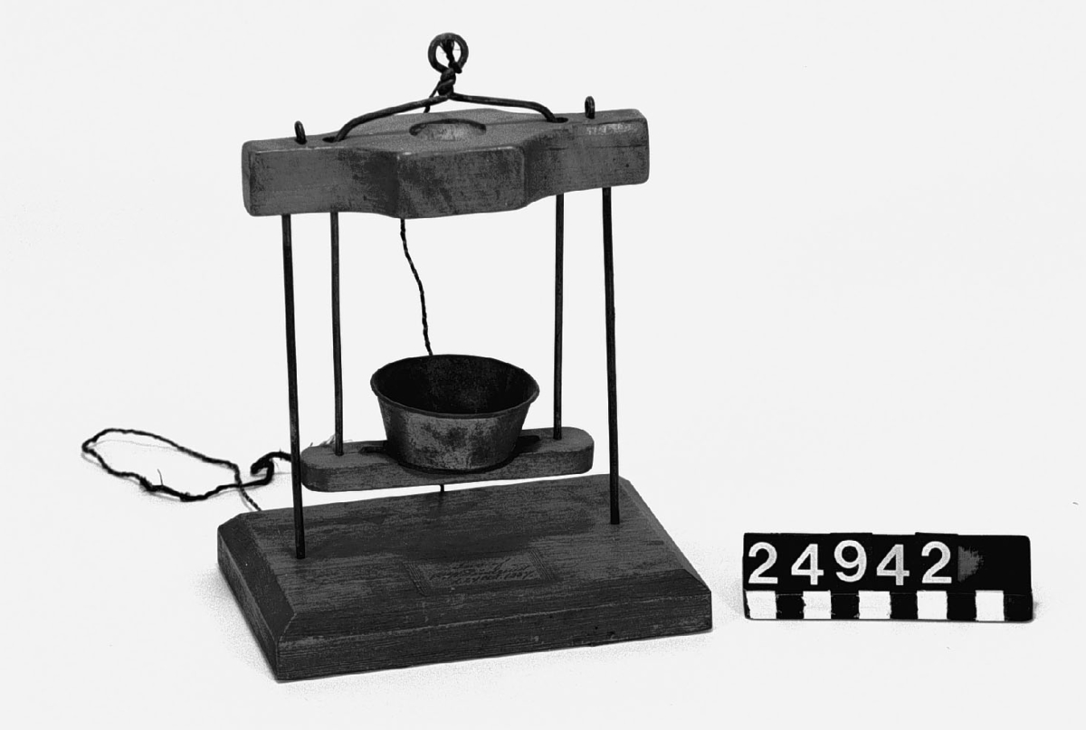 . Bowl-Copper, with glass bottom. Top and bottom glasses set in brass verge rings. Set in brass gimbals. Lubber line painted on white background.