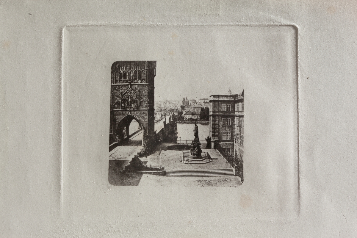 Fotogravyr. Gjort efter ett collodiumnegativ på glas. Belyst genom ett hartsraster. Karlsbron över floden Moldau i Prag.