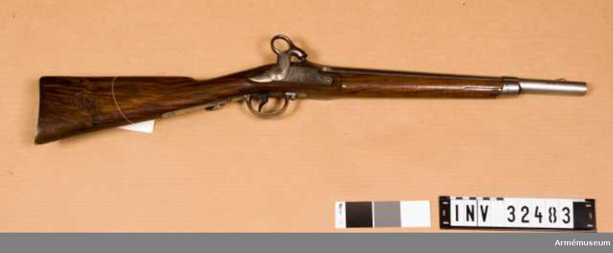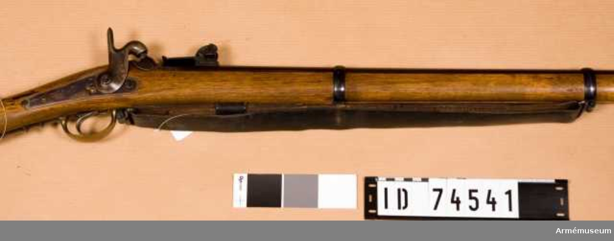 Snider Enfield. Snider Enfield rifle (Infantry pattern). The stock is encircled with three iron bands secured by screws. Brass fore-end cap and brass butt plate. The brass trigger guard is fitted with a lower sling loop, the upper loop being secured to th