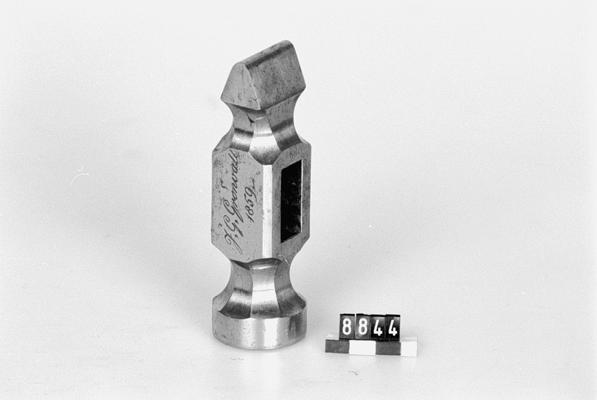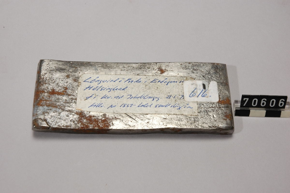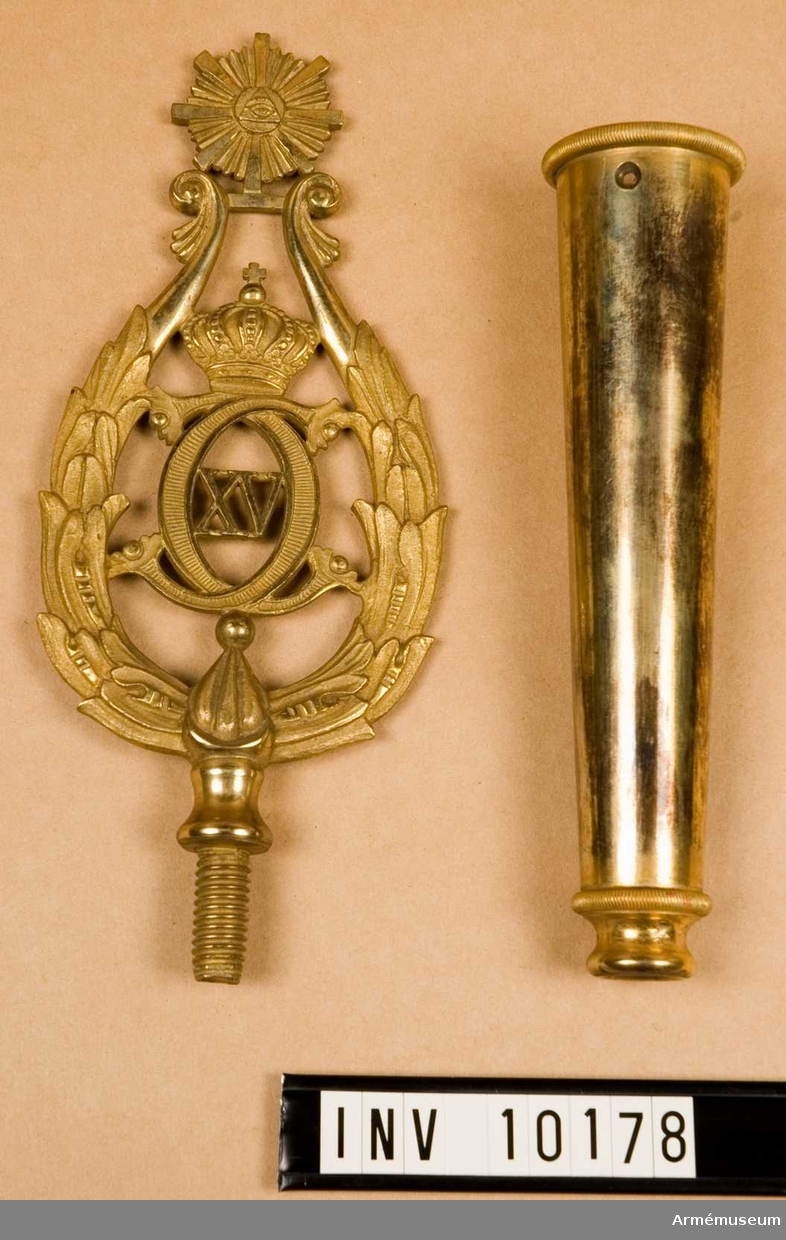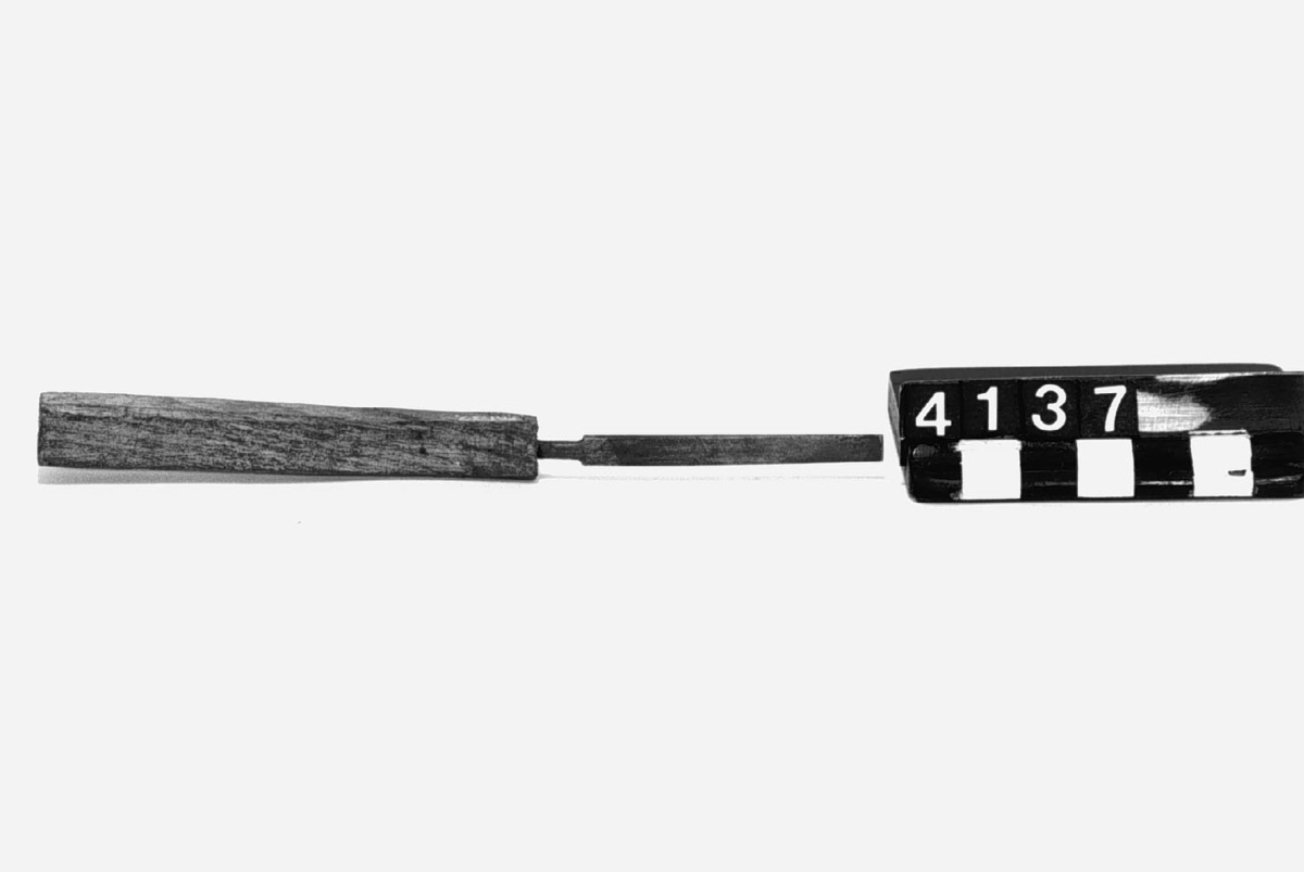 . Cutlass, the hilt of a cutlass consists of a sheet steel half-basket guard. The cutlass has a black cast iron grip. The cutlass has a straight, flat steel blade with a double-edged spear point. The blade was cut down in 1875, when it was reduced in widt