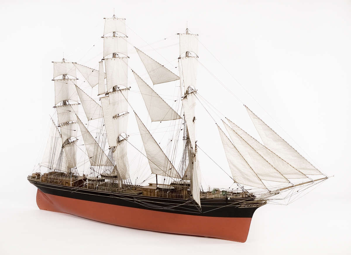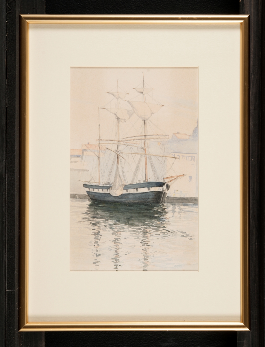 . White glass rolling pin painted in red, green and gold. A centre panel is inscribed: 'A Present from / your Brother / 1859'. On either side, two views of the same schooner-rigged vessel, each with the name 'CHARLES WESLEY' below, one