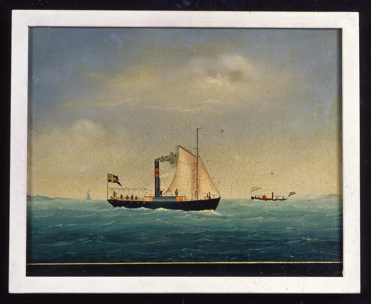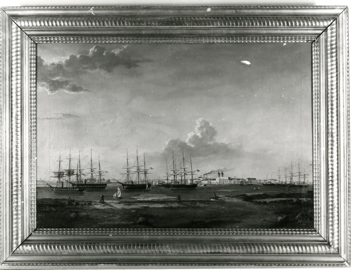 Oljemålning av Landskronas hamn med engelska örlogsfartyg.