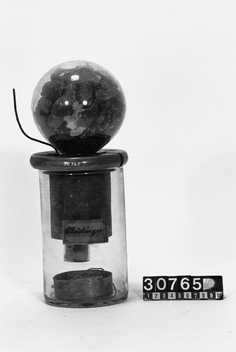 Submarine cable section. A portion of submarine cable. It is cylindrical, brass mount. Shore end of cable. Stranded core of conductors surrounded by layers of gutta percha and tarred hemp. Outer sheathing consists of ten galvanised iron wires.