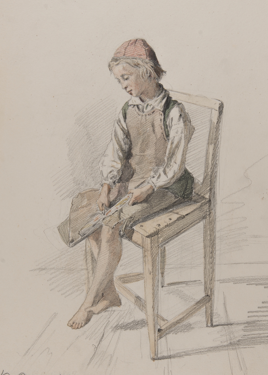 Pojke med skinnförkläde på en stol . Orsad. 19 juli 1867. J Kronberg
